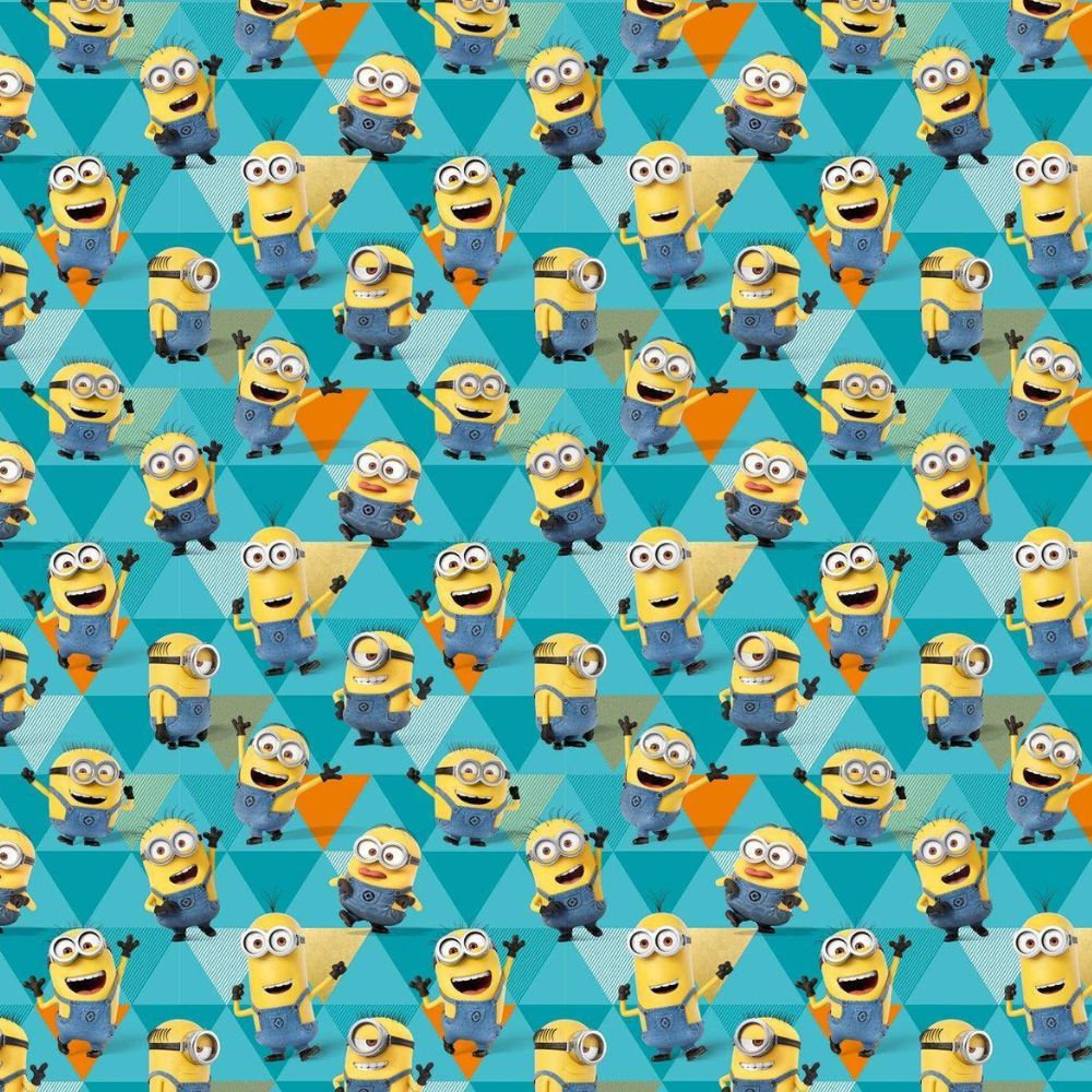A multicoloured background which is mainly blue with a triangular pattern sits behind a host of Minion characters in different animations, great for a birthday gift wrap but suited to any occasion.