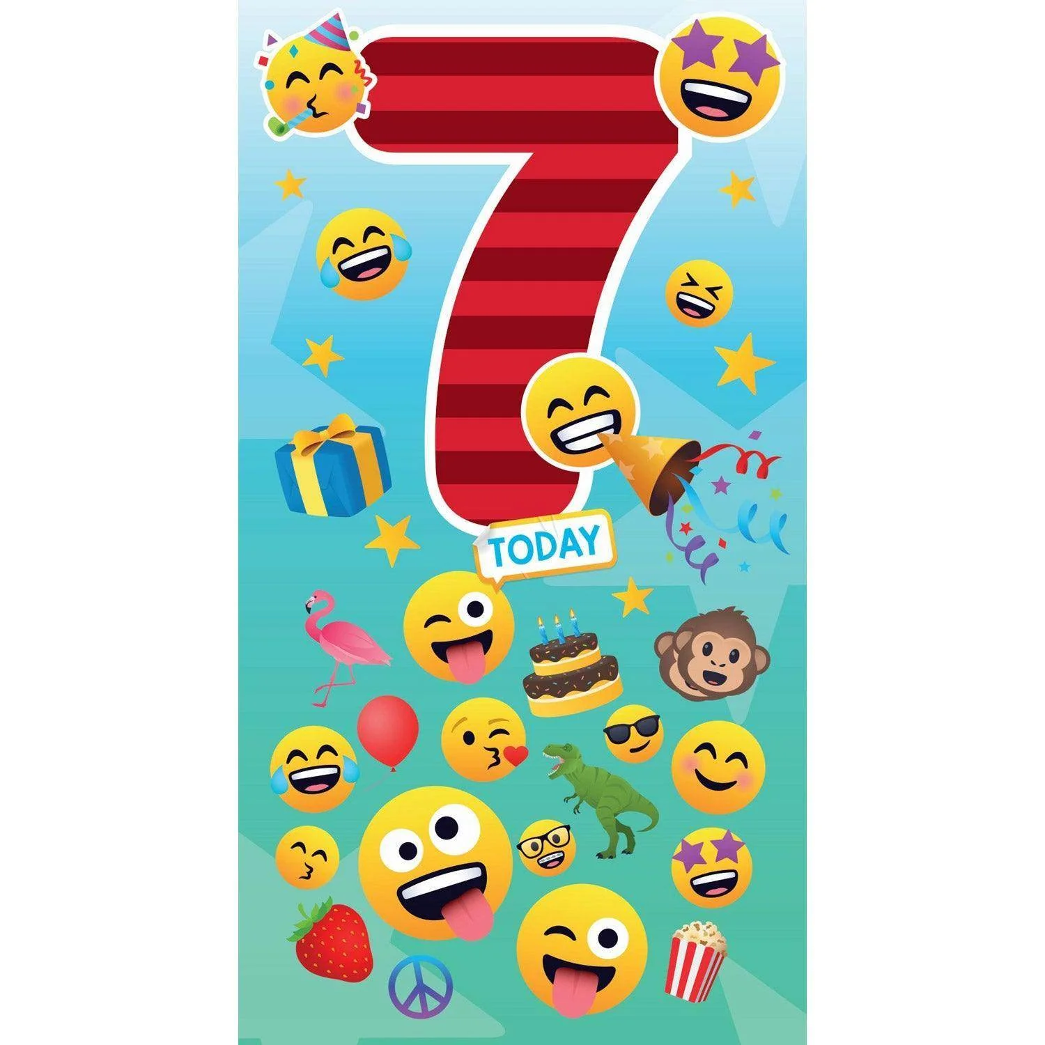 Celebrate a 7-year-olds birthday with this fun JoyPixels card. It is full of emojis with smiles, party hats, and laughter. The number 7 is boldly outlined and followed by "Today" in a speech bubble coming from many's favourite "tongue out" emoji.