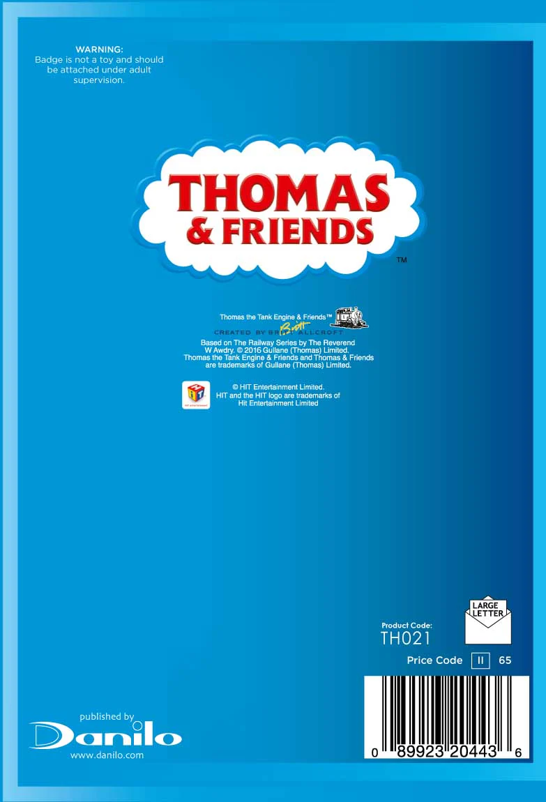 Thomas the Tank Engine, Percy and James the Red Engine are smiling away on the cover of this official Thomas and Friends birthday card, with the message 'Steam team' placed around them. A badge is attached to the top of the card which can be taken off and worn (it is plastic backed not a metal pin). Perfect for a young Thomas fan's birthday.