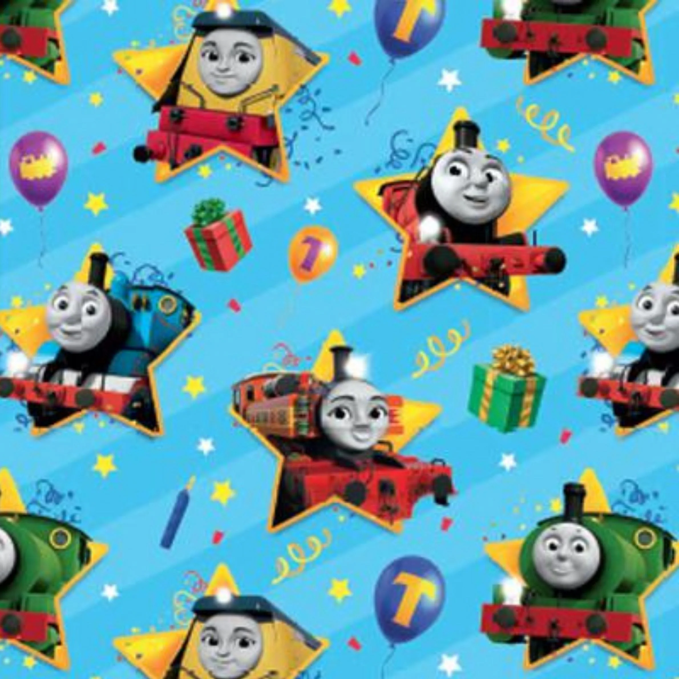 Thomas the Tank Engine is here with friends on this children's wrapping paper. This blue background gift wrap features lots of candles, presents and balloons scattered of the print. Thomas & Friends are also on on the gift wrap smiling away within yellow stars. This pack contains two 70 x 50cm sheets and two tags for message writing.